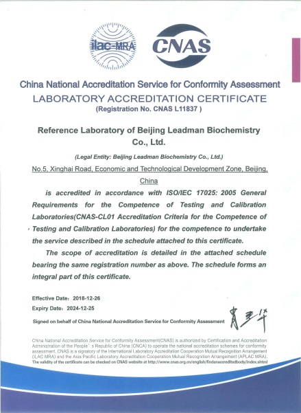 参考实验室于2018年8月向CNAS提交认可申请,9月通过文审,CNAS评审专家组于11月10日-11月11日对米兰·官方站官网参考实验室进行现场评审。经过审核文件、现场检查、现场实验等方式的审查,CNAS评审专家组一致同意通过现场评审。参考实验室于2018年12月26日获得CNAS参考实验室ISO17025和ISO15195的认可证书,认可范围包括ALT、AST、GGT、ALP、AMY、CK、LDH七个酶学参考测量程序。
