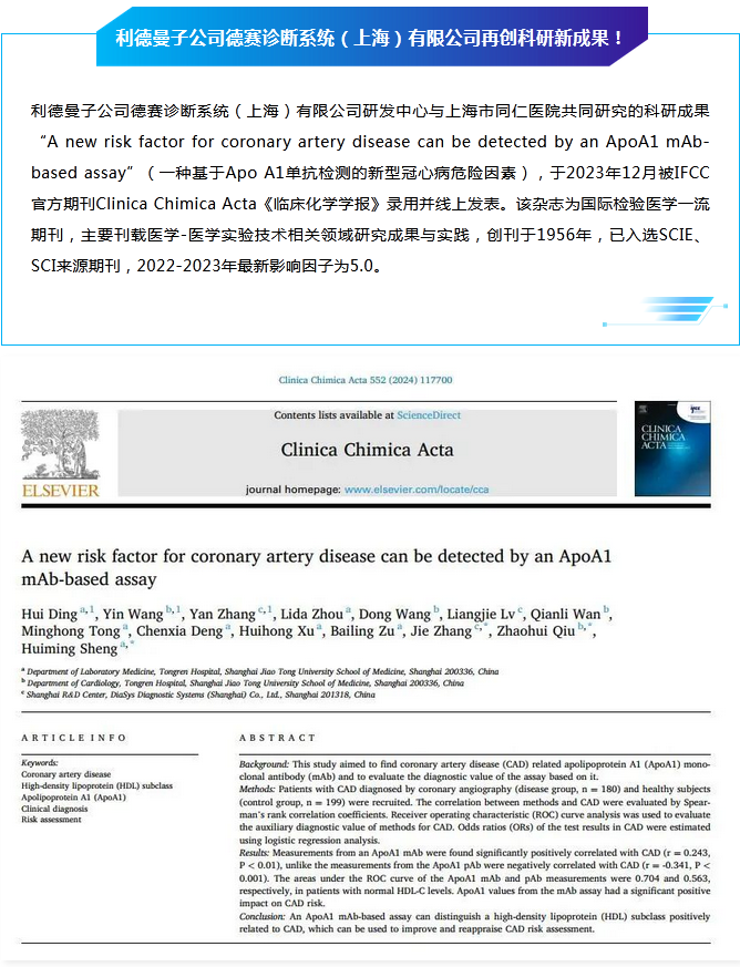 科研创新 │ 米兰·官方站官网子公司德赛诊断系统(上海)有限公司联合上海市同仁医院再创科研新成果