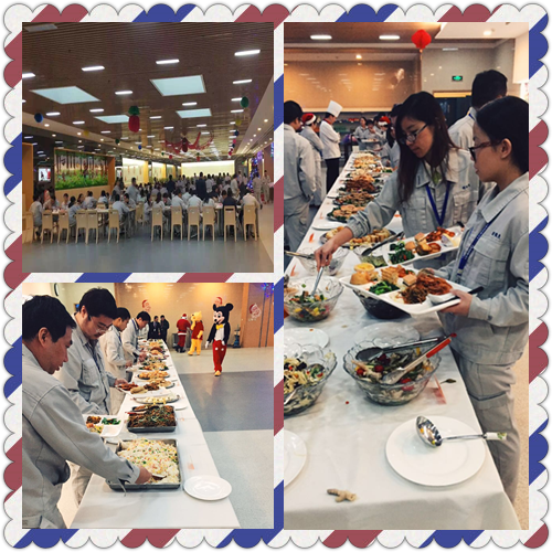 12月25日中午,餐厅里挂满了闪亮的灯,竖起了美丽的圣诞树,电视上播着各个部门为圣诞节而拍摄的集体照,耳边回荡着充满节日氛围的欢快音乐。点餐的窗口改造成了自助取餐的餐台。京味点心,西式糕点,日式菜肴,意式面点,水果沙拉、蔬菜沙拉等应有尽有,所有食物供员工自由选择,且所有食物均无限量供应。